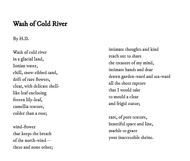 H.D. (Hilda Doolittle) is the author of the poem of the month and was the subject of one of these essays (link below), an extremely fascinating writer who deserves more readers: